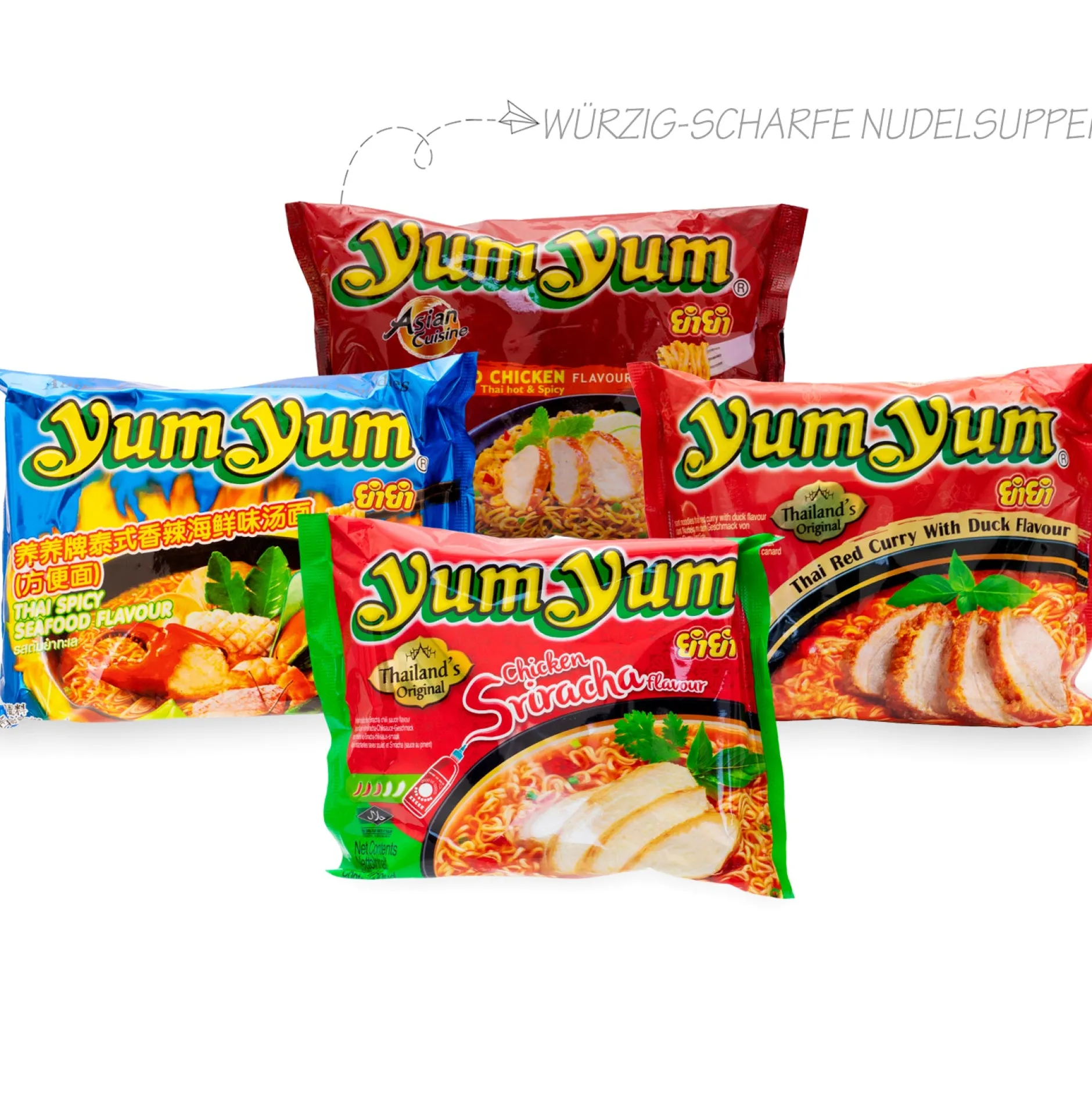 Von insgesamt 16 Yum-Yum-Sorten wählen wir zehn Stück für deine Box zufällig aus. Dabei achten wir darauf, dass du eine ausgewogene Variation der verschiedenen Geschmacksrichtungen erhältst. Deswegen bekommst du sowohl Ramen-Klassiker, wie beispielsweise Shrimp, Huhn oder Gemüse, als auch beliebte thailändische Gerichte wie Green Curry, Pad Thai oder Thai Spicy Soup. Von jeder dieser zehn Sorten sind jeweils drei Packungen in der Box, sodass du insgesamt 30 Packungen Instant-Nudeln bekommst!