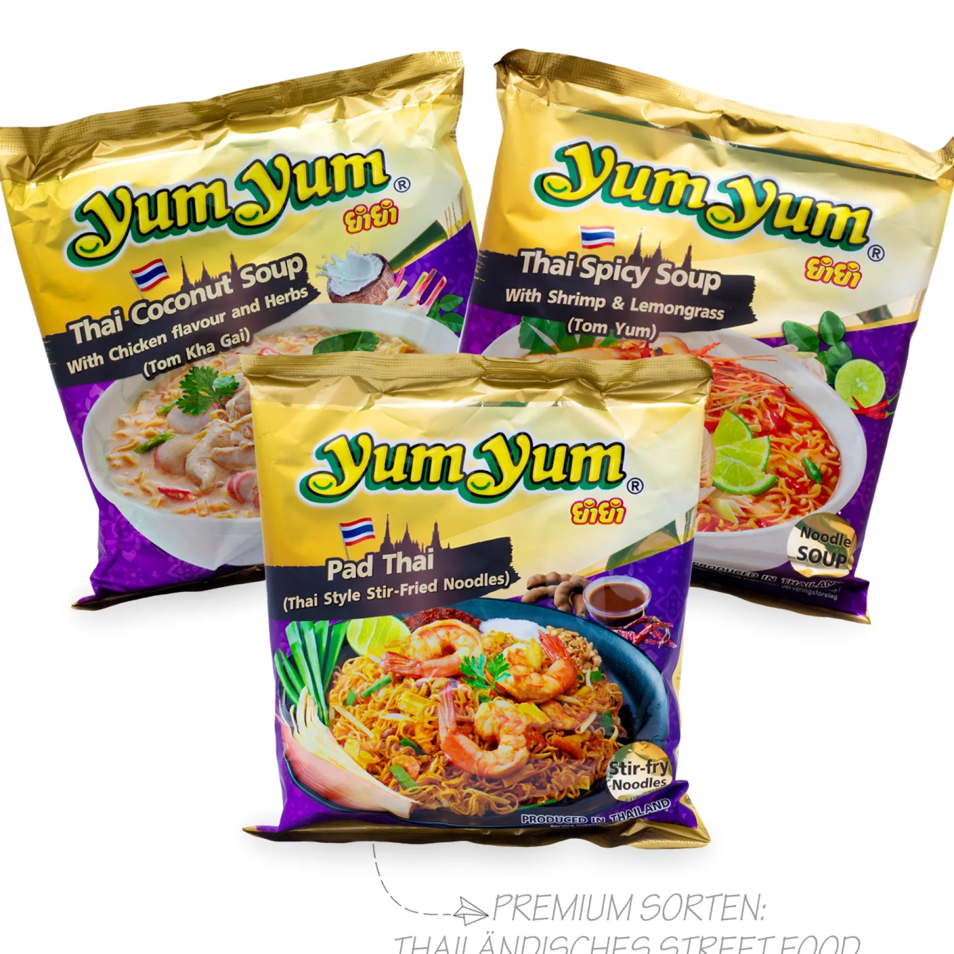 Das erste, was dir auf einer Reise nach Thailand begegnet, ist der Duft von leckerem Essen. Es wird an nahezu allen Straßenecken frisch zubereitet und verkauft. Street-Food ist hier genauso Teil der Kultur wie buddhistische Tempel und wird auch ungefähr genauso hoch geschätzt. Mit unserer Ba Mee Yum Yum Box laden wir dich ein, die thailändische Esskultur kennenzulernen, ohne auch nur einen Fuß in ein Flugzeug zu setzen. Lass dich von den 10 ausgewählten Sorten Instant-Nudeln der beliebten thailändischen Marke Yum Yum überraschen, die wir dir eingepackt haben.
